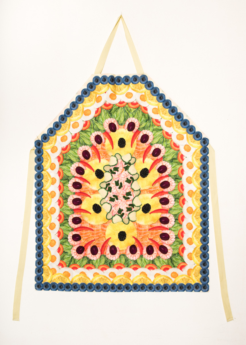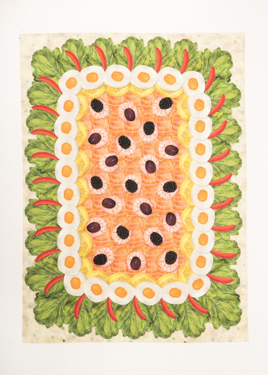 Brauðtertan lifir is a collection based on an Icelandic traditional dish. Brauðterta (e. breadcake) consists of white bread mayonnaise, vegatables, fruits, meat and fish. Brauðterta is often served on special occasion and family gatherings. The idea for the brauðterta project was inspired by the collaboration with Loji Höskuldsson, Pull up your socks, a national sports and arts teamwear. The brauðterta was the symbol for the Icelandic swimteam. The concept was developed further as a homewear collection inspired by confirmations, a special occasion where brauðterta is often served.